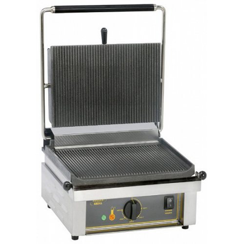 ОписаниеГриль контактный Roller Grill Panini R с рифлеными чугунными поверхностями предназначен для использования предназначен для жарки мяса, птицы, рыбы, овощей, а также для приготовления стейков, гамбургеров и горячих сэндвичей на предприятиях общественного питания и торговли, специализирующихся на приготовлении фаст фуда.Давление верхней рабочей поверхности регулируется прижимной пружиной, что обеспечивает адаптацию к различной толщине приготовляемого продуктаОсобенностиТерморегулятор позволяет устанавливать температуру от 0 до 350 ºСНагрев осуществляется одновременно сверху и снизуВремя приготовления продукта: не более 2,5 минКорпус выполнен из нержавеющей сталиРабочие поверхности изготовлены из чугунаРучки выполнены из термостойкого материалаСъемный поддон для сбора лишнего жираДавление верхней рабочей поверхности регулируется прижимной пружинойВ комплекте скребок для легкой очисткиХарактеристикиПроизводительность: 48 панини/часРазмер жарочной поверхности: 260х240 мм