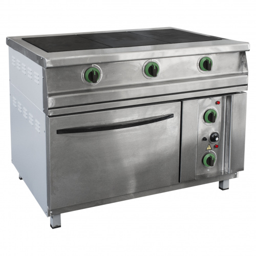 Плита оснащена четырьмя чугунными конфорками общей площадью 0,51 м2. Размеры конфорки 530х320 мм. Жарочный шкаф имеет 3 уровня для противней размером 570х470 мм. В комплекте идут 2 противня из черного метала размером 570х470х40 мм. Жарочный шкаф имеет раздельную регулировку мощности верхнего и нижнего тенов. Шкаф автоматически поддерживает заданную температуру от 50 до 300 С. Жарочный шкаф оснащен аварийным предохранителем от перегрева свыше 300 С. Плита оснащается регулируемыми по высоте ножками. Поставляется в собранном виде на поддоне. Упаковка гофрокартон