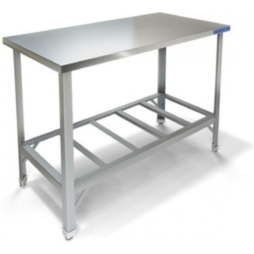 Стол производственный имеет разборную конструкцию. Он состоит из столешницы, изготовленной из пищевой нержавеющей стали и каркаса, изготовленного из конструкционного профиля, покрытого порошковой краской. Столы без борта устанавливаются в центре кухонного помещения и предназначены для четырёхстороннего доступа к рабочей поверхности.
