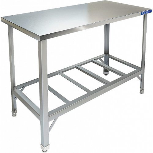 Столы производственные имеют широкую область применения: в пищеблоках, продовольственных магазинах, в цехах, связанных с переработкой пищевого сырья и т.д. Стол производственный имеет разборную конструкцию. Он состоит из столешницы, изготовленной из пищевой нержавеющей стали и каркаса, изготовленного из конструкционного профиля, покрытого порошковой краской. Столы без борта устанавливаются в центре кухонного помещения и предназначены для четырёхстороннего доступа к рабочей поверхности.Столы укомплектованы решётчатой полкой, возможна комплектация сплошными полками из пищевой нержавеющей стали. Ножки стола снабжены регуляторами высоты, что позволяет устранять неровности пола. В изготовлении столешницы предусмотрены звукопоглощающие подкладки. В конструкции стола использованы элементы для придания устойчивости и предотвращения раскачивания во время эксплуатации. Универсальная конструкция позволяет легко производить сборку стола.Дополнительные характеристикиТолщина материала:
