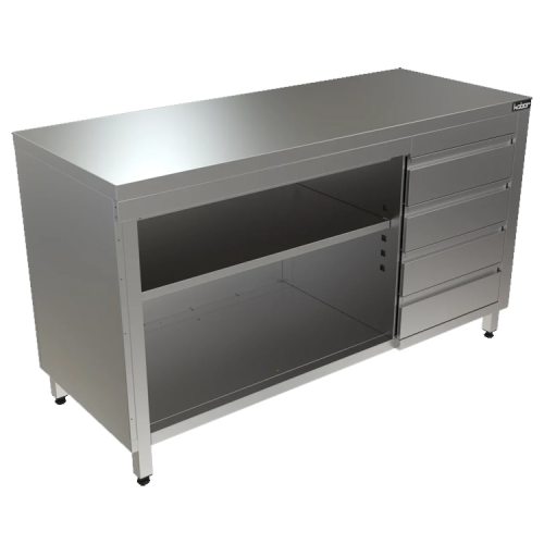 Особенности:- столешница - нерж. сталь. aisi 430- усиление ЛДСП,- каркас разборный из нерж. стали 430- 4 выдвижных ящика, полка